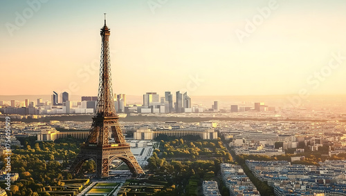 A glowing sunset lights up Paris skyline, the Eiffel Tower stands tall over the city and its beautiful streets.