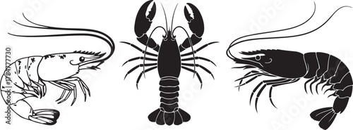 Three vintage style illustrations of crustaceans including shrimp and a lobster