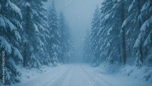 winter road through forest with snowfall snowy pine trees and cold winter landscape outdoors