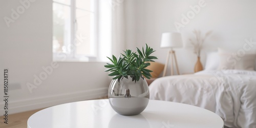Green plant in a metal vase placed on a sleek, modern table in a minimalist bedroom, used for interior decor planning