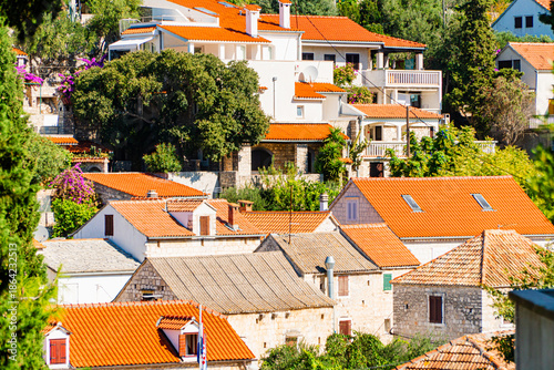 Miasto Maslinica na wyspie Solta w Chorwacji. Tradycyjna zabudowa i wąskie uliczki. Domy z czerwoną dachówką.