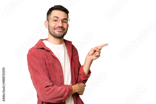Young handsome caucasian man over isolated chroma key background pointing finger to the side