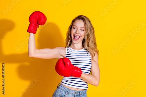 Happy young woman with boxing gloves flexing arm in a cheerful pose on a vibrant yellow background