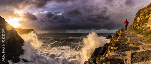 Dramatic Ultrawide Landscape of Powerful Ocean Waves Crashing Against Rocky Cliffs at Sunset with a Person in a Red Jacket Walking Along a Stone Path Under Dark Stormy Clouds on the Coastline.