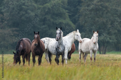 Konie wielkopolskie na łące, stado koni na pastwisku, stadnina