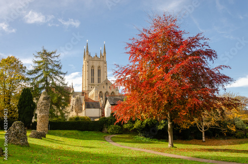 Autumn picture of St Edmundsbury Cathedral with a beautifuly colourful red tree.