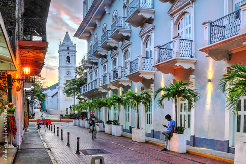 Avenida Central in Casco Viejo, Panama with Santa Maria La Antigua - Metropolitan Cathedral - in the background at sunset
