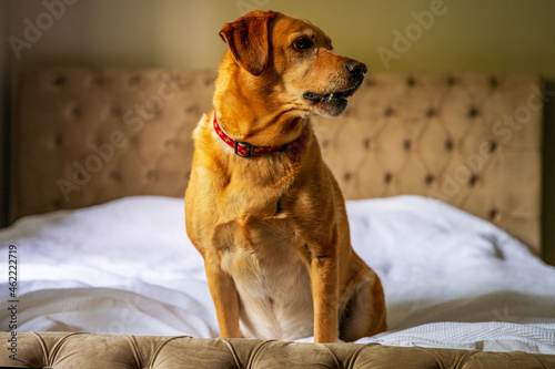 Labrador siedzi na kanapie, patrzy w bok od kamery, szczeka.