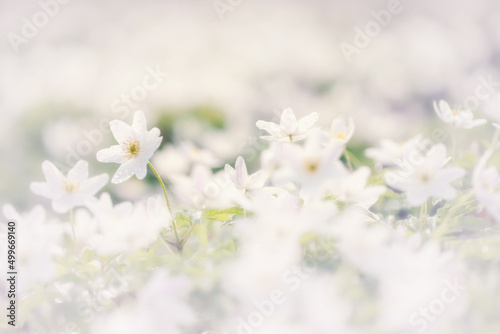 Kwitnące zawilce gajowego. Wiosenna polana w lesie, ujęcie z przodu