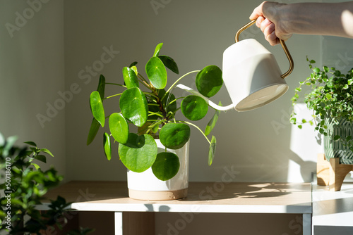 Woman watering potted Pilea peperomioides houseplant on the table at home, using white metal watering can, taking care. Hobby, indoor gardening, plant lovers.