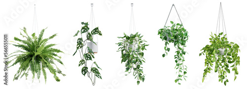 Collection of beautiful plants hanging in ceramic pots isolated on transparent background. 3D render.