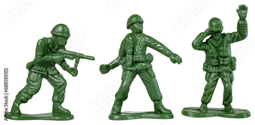 Green toy soldiers isolated on a transparent background. Traditional figurines.