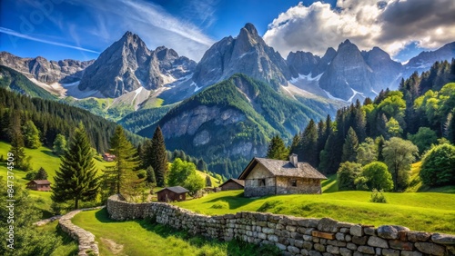 Serene austrian alps summer road scene with lush greenery, rustic stone walls, and towering mountain peaks under clear blue sky.