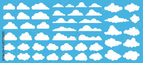 Abstract vector white cloud silhouette collection in cute flat cartoon style for web background. Nature sky, cloud pattern, fume or misty fog art. Food smoke, cloud texture and weather element symbol.