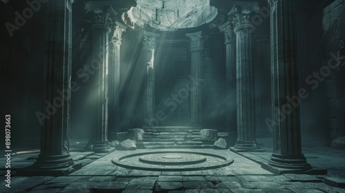 Sunbeams illuminate the interior of an ancient temple casting ethereal light on the stone