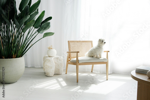 Pies maltańczyk na krześle w jasnym nowoczesnym wnętrzu - zwierzęta domowe - piesek w domu