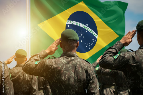 Brazilian soldiers giving salute during ceremony military, glory and honor, dignified military uniform