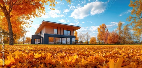 A vibrant autumn landscape of a modern house with a backdrop of golden leaves and a clear blue sky, emphasizing the beauty of the season.