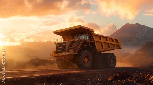 Massive Articulated Dump Truck Traversing Dramatic Mountainous Landscape at Dusk