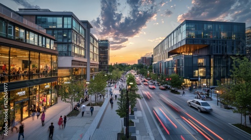 Urban Sunset Boulevard: A vibrant cityscape at sunset, showcasing modern architecture, bustling streets, and pedestrian walkways. The image evokes a sense of urban energy and sophisticated living.