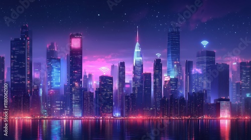 Sygnal Wi-Fi nad rozświetloną nocą miejską, z nowoczesnymi wieżowcami i jasnymi światłami, uwydatniający technologiczną przyszłość i dynamiczny charakter miejskiego krajobrazu.