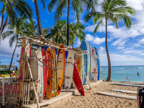 Surfboards lined up on Waikiki beach.
