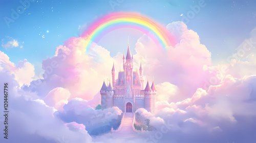 Rainbow unicorn castle in the cloud sky of fantasy background. Fantasy Castle. Illustration