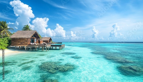 Stunning luxury modern bungalow with beachfront jacuzzi in the maldives under blue skies
