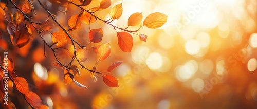 Beautiful autumn leaves illuminated by sunlight in a serene forest during the golden hour