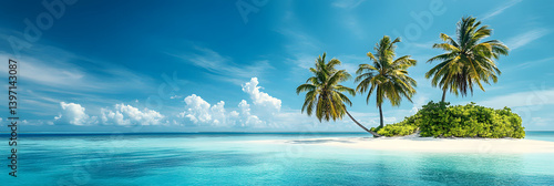 pristine tropical island paradise - adorned with swaying palm trees and surrounded by the clear blue sea wide banner -