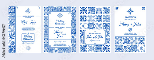 Azulejos invitation. Mediterranean tiles cards. Portuguese decorative texture elements for wedding invitations. Spanish blue and white party design template. Vacation vibe vector set