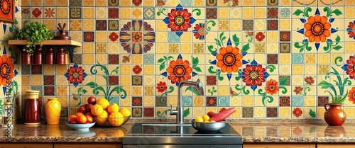 Vibrant Spanish-style kitchen mosaic backsplash with vector tile pattern & Portuguese motifs, art, artwork