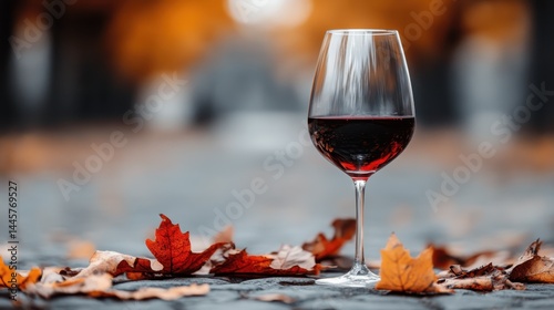 A captivating image of a glass of red wine gracefully positioned among a spread of fallen autumn leaves, representing the warmth and nostalgia of the fall season.