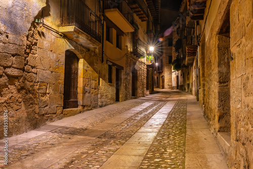 Alley with medieval stone houses at night lit with street lamps, Valderrobles, Teruel.