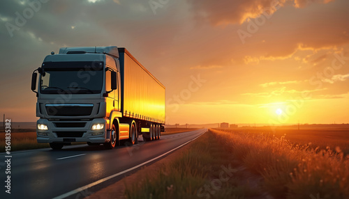 European truck on asphalt road in rural area at sunset. Transportation industry, cargo delivery, logistics concept. Commercial vehicle on highway. Scenic panoramic view of countryside at sunrise