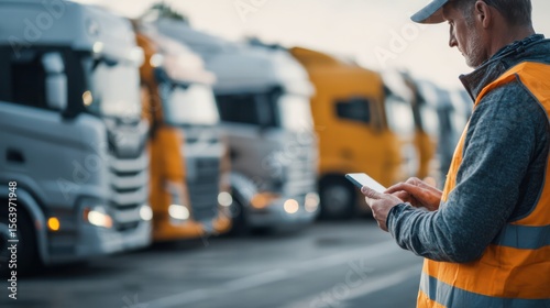 A truck driver wearing a reflective vest is focused on his mobile device while standing near a lineup of parked trucks. The atmosphere is early morning, with soft lighting
