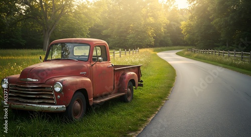 Vintage Pickup Truck Parked Near Winding Country Road at Sunset