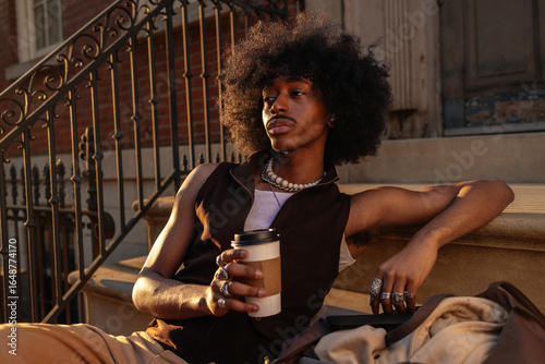 Leisure time with coffee in city sunset