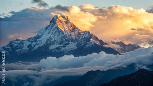 Majestic annapurna mountain peak in nepal at sunrise with snow covered summit and clouds in the valley, a beautiful himalayan landscape