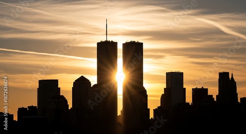 Twin towers world trade center new york city skyline at sunset silhouette scenery