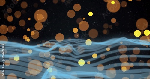Displaying abstract light-blue waveform patterns rippling over dark void, with glowing bokeh lights