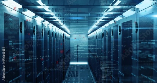 Streaming code projections along data center corridor, highlighting server racks and LED lights