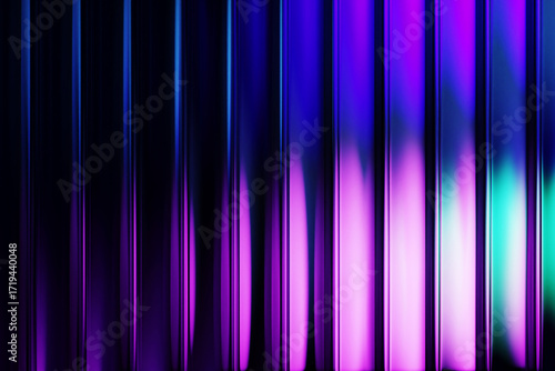 Neon ribbed fractal glass texture 3d background. Abstract bright fluted vertical line pattern with purple blue green gradient, radiant color effect on dark bg. Futuristic digital tech. 3D illustration