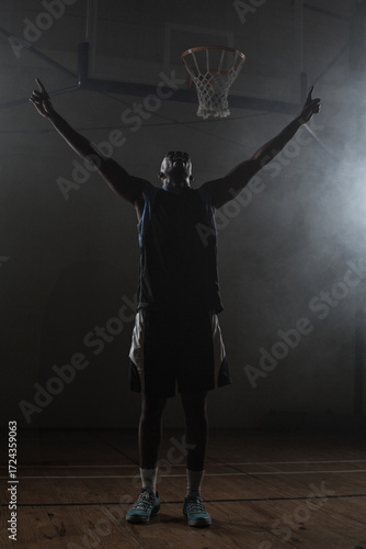 Basketball player standing on wooden court under hoop in dim gym while haze drifts around lights