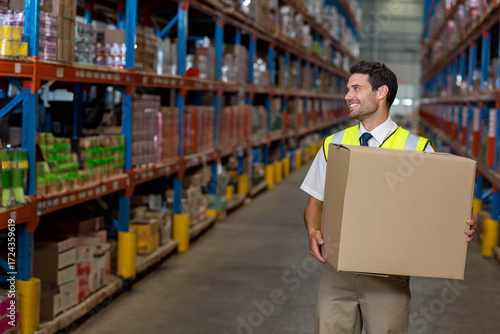 Stacks of cardboard boxes stretching on tall metal racks along warehouse aisle under bright lights