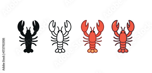 Vector icon lobster same pose same proportions four styles black solid glyph outline minimal flat multicolor filled cartoon flat shaded.