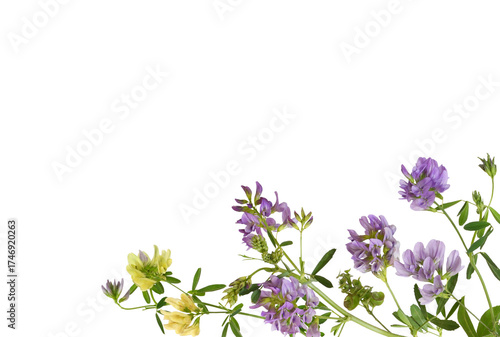 Twigs of purple and yellow yellow, flowers and green leaves of lucerne (Medicago) in a corner arrangement isolated on white or transparent background