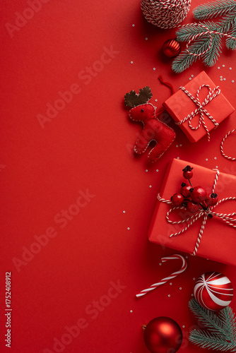 Vertical composition featuring gift boxes wrapped in twine, red ornaments, a plush reindeer, candy canes, and pine sprigs on a bold red backdrop