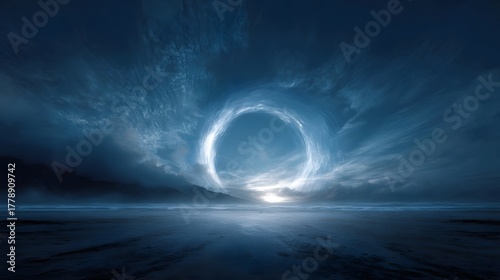 A dramatic glowing portal of swirling energy opens in an ethereal blue sky above a dark reflective landscape