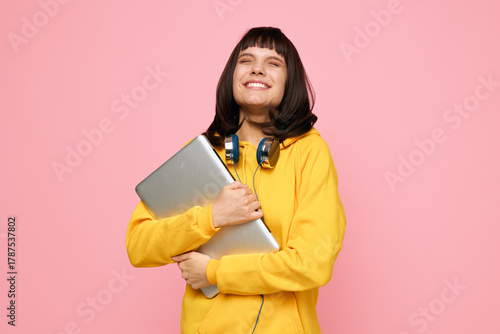 A cheerful student stands against a pink backdrop, hugging a laptop and wearing headphones. This bright, contemporary portrait conveys creativity, study, and positive energy.